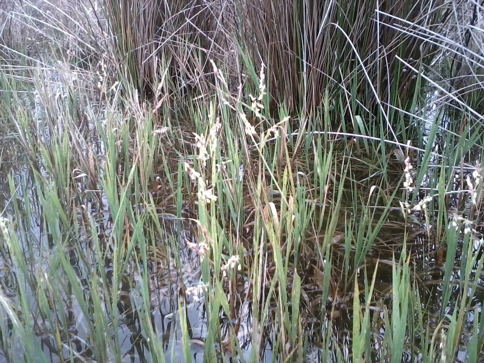 During any or all of our vegetation monitoring cycles, I always look for something new in the ponds. Mostly, I do this because it is not a given that I will get a complete picture of the plant community in any of the “transect” points. So, it behooves me to look around at the surrounding areas when we are tallying up each sample plot. This last cycle reminded me of the blessed nature of natural “recruits”—in this case, Leersia hexandra or commonly called: southern cutgrass.